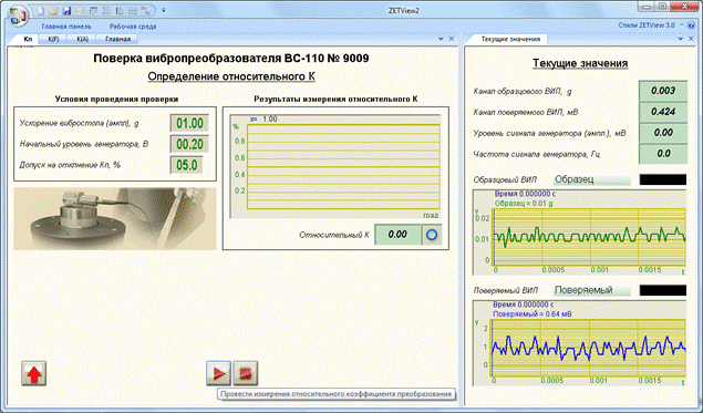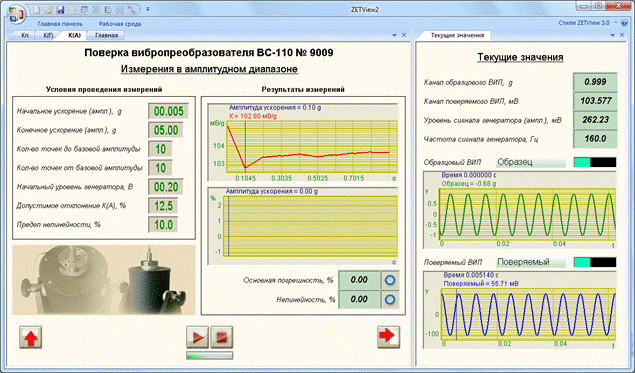 14 В процессе измерений на вкладке «К(А)» под кнопками «Старт» и «Стоп» отобразится индикатор процесса, а на верхнем графике в рамке «Результаты измерений» будет строиться график зависимости коэффициента преобразования от амплитуды виброускорения, на вкладке «Текущие значения» отобразятся показания вольтметров по образцовому и измерительному каналам, напряжение и частота генератора, осциллограммы и интегральные уровни сигналов с вибропреобразователей (Рисунок 6.6).