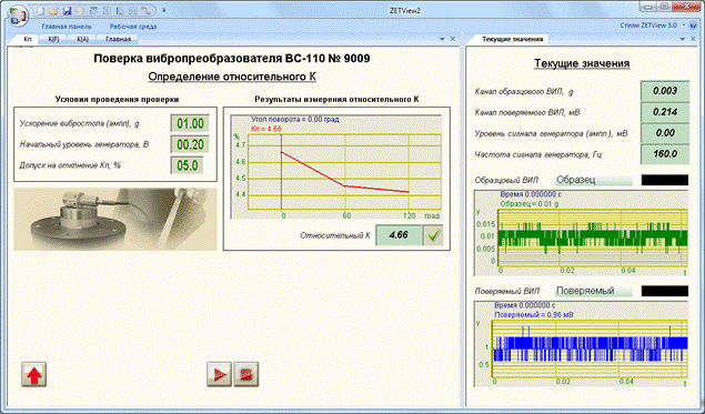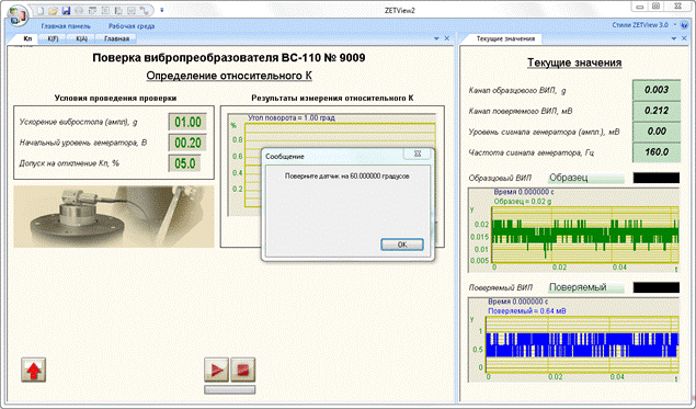 25 В процессе измерений на вкладке «Кп» под кнопками «Старт» и «Стоп» отобразится индикатор процесса, а на графике в рамке «Результаты измерений» будет строиться график зависимости коэффициента преобразования в поперечном направлении от угла поворота шестигранного устройства, на вкладке «Текущие значения» отобразятся показания вольтметров по образцовому и измерительному каналам, напряжение и частота генератора, осциллограммы и интегральные уровни сигналов с вибропреобразователей.
