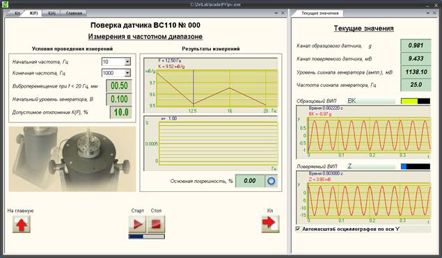 19 В процессе измерений на вкладке «К(F)» под кнопками «Старт» и «Стоп» отобразится индикатор процесса, а на верхнем графике в рамке «Результаты измерений» будет строиться график зависимости коэффициента преобразования от частоты, на вкладке «Текущие значения» отобразятся показания вольтметров по образцовому и измерительному каналам, напряжение и частота генератора, осциллограммы и интегральные уровни сигналов с вибропреобразователей (Рисунок 6.8).