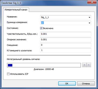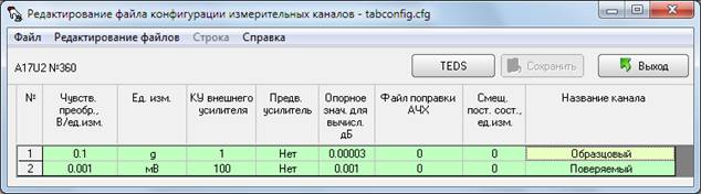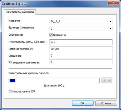 Внимание! При настройке измерительного канала, к которому подключен образцовый датчик через усилитель заряда типа 2626 фирмы Bruel&Kjaer, в программе «Редактирование файлов параметров» в качестве чувствительности указывается значение, установленное переключателем «Volt/Unit Out». Наиболее оптимальным коэффициентом преобразования измерительного тракта «датчик ‑ усилитель заряда» является 100 мВ/g или 10 мВ/м/с^2