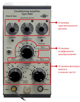 При подключении поверяемого датчика через усилитель заряда типа 2626 B&K в качестве коэффициента преобразования датчика на усилителе задаётся 1 пКл/ед. изм (переключатели под надписью «Sensitivity pC/Unit»). При этом коэффициент преобразования системы «поверяемый датчик – усилитель заряда» устанавливается таким образом, чтобы сигнал с датчика в крайних точках амплитудного и частотного диапазонов превышал уровень собственных шумов в несколько раз.