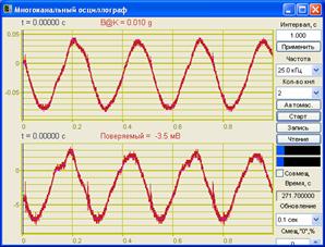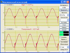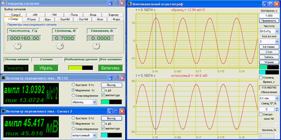 Амплитуда ускорения вибростола определяется по показаниям образцового датчика. Для настройки усилителя мощности необходимо устанавливать напряжение на генераторе таким образом, чтобы показания по образцовому датчику были равны: