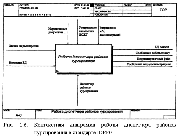 На рис. 1.6 приведена контекстная диаграмма диспетчера районов курсирования, выполненная в стандарте IDEF0 с помощью пакета BPWin в рамках работ по созданию автоматизированного рабочего места (АРМ) диспетчера районов курсирования. Диаграмма содержит одну операцию (активность), названную "Работа диспетчера районов курсирования".