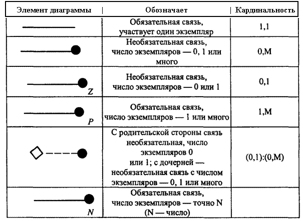 -обязательностью связи — возможностью отсутствия экземпляров сущности для связи. Степень и обязательность каждого конца связи определяют показатель, называемый кардинальностью связи. Этот показатель содержит две цифры: первая (0 или 1) указывает наименьшее, а вторая (1 или М) — наибольшее число экземпляров сущности, которые могут участвовать в связи. Если первая цифра "0" , то связь является необязательной (см. также раздел «Проектирование БД»). Например, обозначение (1,1) указывает на обязательную связь, в которой участвует один экземпляр сущности; (0,М) - необязательная связь, число экземпляров любое (т. е. 0,1, или много)и т. д.