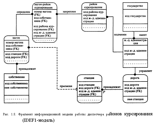 На диаграмме рис. 1.8 имеется сущность ВАГОН-РАЙОН КУР-СИРОВАНИЯ, которой нет на функциональной схеме. Необходимость введения этой сущности связана с требованием, чтобы все связи были типа "один к одному" или "один ко многим". Рассмотрим связь сущностей ВАГОН и РАЙОН КУРСИРОВАНИЯ. Пусть N — число экземпляров вагона, а М — число районов курсирования. Тогда связь (отношение) между этими сущностями типа N:M (любой вагон может курсировать в любом районе и любой район курсирования допускать любое число вагонов). Чтобы преобразовать это отношение к типу "один ко многим", вводится дополнительная сущность ВАГОН-РАЙОН КУРСИРОВАНИЯ. Теперь каждому экземпляру вагона соответствует М экземпляров дочерней сущности ВАГОН-РАЙОН КУРСИРОВАНИЯ, а каждый экземпляр дочерней сущности ассоциирован только с одним экземпляром родительской сущности ВАГОН. Связь между сущностями ВАГОН и ВАГОН-РАЙОН КУРСИРОВАНИЯ относится к типу 1:М.