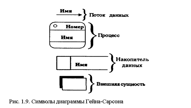 Простота DFD заключается в использовании только четырех символов для описания функций любой информационной системы на любом уровне детализации: символа для идентификации внешних объектов (внешних сущностей — материальных предметов или физических лиц, являющихся источником или приемником информации), символа для идентификации накопителей данных, символа для указания процессов и символа для указания направления движения данных (рис. 1.9).