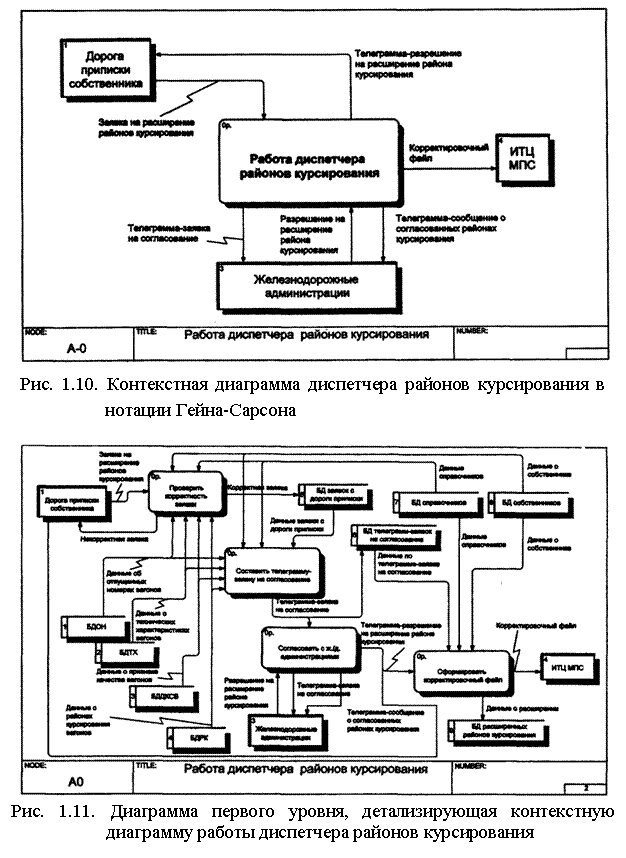 Рассмотрим диаграммы потоков данных (контекстную и первого уровня) для описания деятельности диспетчера районов курсирования (см. п. 1.7.4.2.). Контекстная диаграмма в нотации Гейна-Сарсона показана на рис. 1.10. Выделены три внешние сущности: ДОРОГА ПРИПИСКИ СОБСТВЕННИКА, ИТЦ ГВЦ МПС, ЖЕЛЕЗНОДОРОЖНЫЕ АДМИНИСТРАЦИИ; показаны потоки данных между диспетчером районов курсирования и этими объектами. На рис. 1.11 приведена диаграмма, детализирующая эту контекстную диаграмму. В отличие от IDEF0-моде-ли, приведенной на рис. 1.7, в этом случае кроме операций присутствуют элементы, обозначающие внешние сущности и базы данных (накопители данных).