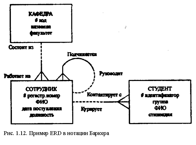 На рис.1.12 приведен пример ERD в нотации Баркера, в котором выделены сущности КАФЕДРА, СОТРУДНИК, СТУДЕНТ, определены отношения между ними, степень связи и обязательности отношения.