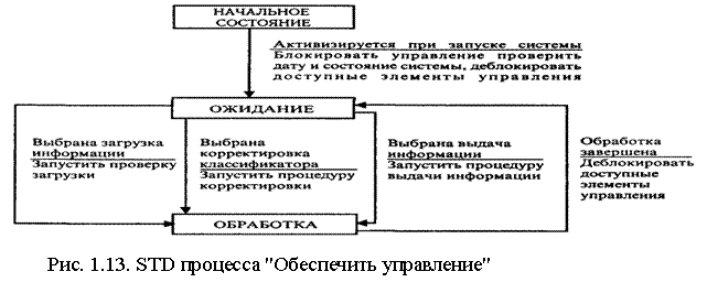 На рис. 1.13 приведены пример STD процесса ОБЕСПЕЧИТЬ УПРАВЛЕНИЕ. Здесь введены следующие состояния: НАЧАЛЬНОЕ СОСТОЯНИЕ, ОЖИДАНИЕ, ОБРАБОТКА. В свою очередь ОБРАБОТКА означает выполнение одной из трех процедур (ЗАГРУЗКА ИНФОРМАЦИИ, КОРРЕКТИРОВКА КЛАССИФИКАТОРА, ВЫДАЧА ИНФОРМАЦИИ).