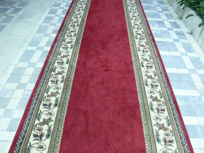 Кремлёвская ковровая дорожка - или эквивалент. | Ширина - 1,5 метра ; Цвет - «Бордо» однотонный по центру 70 см., по краям дорожки орнамент 38 см., отступление от края дорожки 3 см.; Тип рисунка – «Кремлёвская дорожка»; Вид ворса – разрезной; Материал ворса - 20% шерсть, 80% - полипропилен; Нить - HEATSET ; Материал основы/ утка - х/б, джут; Плотность изделия на 10см. – 32/104; Количество ворс. пучков/ на кв. м. – 332-800; Высота ворса – 11мм.; Вес ворсовой основы - 1175г/кв. м.; Общий вес – 2025г/кв. м.; | п. м. | 500 |