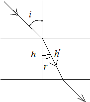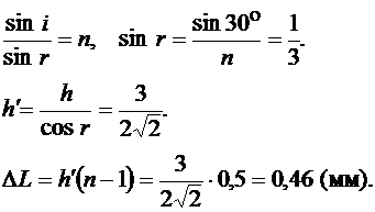 Во втором случае луч, падая на пластинку, будет преломляться, то есть проходить в пластинке путь h΄¹h, который найдем, пользуясь законом преломления