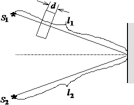 Задача 2. От двух когерентных источников S1 и S2 (l=0,8 мкм) лучи попадают на экран, на котором наблюдается интерференционная картина. Когда на пути одного из лучей перпендикулярно ему помещается мыльная пленка (n=1,33), интерференционная картина изменяется на противоположную. При какой наименьшей толщине пленки это возможно?