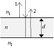 Задача 3. Плоскопараллельная стеклянная пластинка толщиной 1,2 мкм и показателем преломления n=1,5 помещена между двумя средами с показателями преломления n1 и n2 рис. 3. Свет с длиной волны l=0,6 мкм падает нормально на пластинку. Определить результат интерференции световых лучей 1 и 2, отраженных от верхней и нижней поверхностей пластинки, в следующих случаях:
