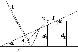 Интерференционные полосы (полосы равной толщины) наблюдаются у поверхности клина (интерференция лучей 1 и 2 произойдет в точке А).
