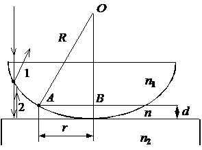 Таким образом, при нормальном падении света на пластинку, оптическая разность хода лучей 1 и 2 будет равна D= 2dn + (l/2), если один из лучей отражается от оптически более плотной среды, или D= 2dn, если оба луча отражаются от оптически более плотной среды или оба луча отражаются от оптически менее плотной среды.