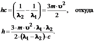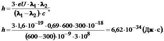 Задача 19. Электроны, вылетевшие из некоторого металла при облучении его светом с длиной волны 600 нм, задерживаются напряжением U = 0,69 В. При уменьшении длины волны падающего света в два раза, скорость фотоэлектронов увеличивается в два раза. Определить из этих данных постоянную Планка.