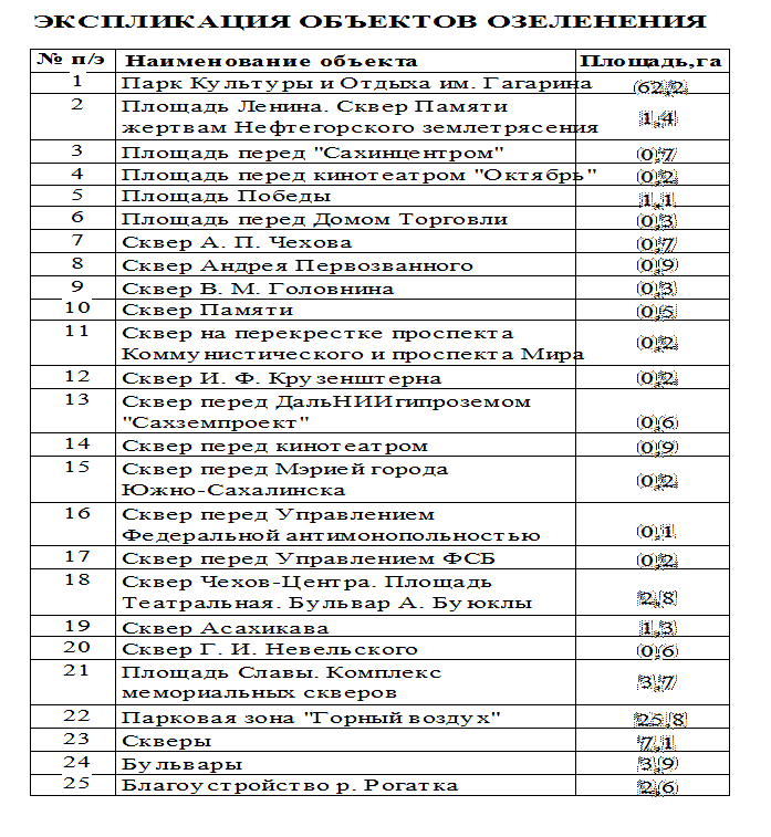 В соответствии с РНГП Сахалинской области норма зеленых насаждений общего пользования в микрорайоне составляет 30 м2/чел, норма зеленых насаждений жилых микрорайонов и кварталов - 24 м2/чел.