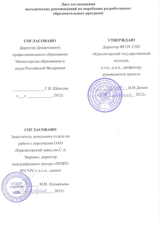 К участию в разработке Методических рекомендаций были привлечены все разработчики новых сетевых образовательных программ: , к. т.н., доцент., заместитель директора по научно-методической работе; , к. п.н., зав. отделением «Программное обеспечение ВТ и АС» ФГОУ СПО «Красногорский государственный колледж»; , зав. учебной частью ФГОУ СПО «Красногорский государственный колледж»; , начальник Центра нанотехнологий ФГБОУ ВПО «Астраханский государственный технический университет», к. т.н., доцент кафедры Автоматизации технологических процессов; С., директор ФБГОУ СПО «АКВТ», к. п.н.; , преподаватель специальных и общепрофессиональных дисциплин ФБГОУ СПО «АКВТ»; , преподаватель специальных дисциплин высшей квалификационной категории ФГОУ СПО «Новосибирский химико-технологический колледж им »; , преподаватель специальных дисциплин, зав. лабораторией спектрального анализа, измерительных приборов - Новосибирский завод имени Коминтерна»; , преподаватель специальных дисциплин высшей квалификационной категории ФГОУ СПО «Новосибирский химико-технологический колледж им »; , преподаватель специальных дисциплин ОГБОУ СПО «Смоленский промышленно – экономический колледж»; , научный сотрудник Института химии твердого тела и механохимии СО РАН, преподаватель ФГОУ СПО «Новосибирский химико-технологический колледж им ».