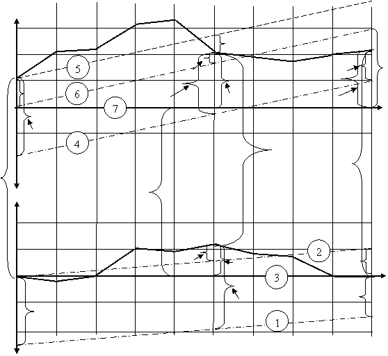 Исполнительную схему планового положения подкрановых путей составляют на листе миллиметровой бумаги в масштабах: горизонтальный 1 : 300, вертикальный 1 : 1. В центральной части листа на расстоянии 6 – 7 см друг от друга проводят координатные оси х обеих ниток путей (рис. 7.8). Перпендикулярно им проводят оси y, а также создают координатную сетку по числу осей здания. В соответствующих графах из табл. 7.1 выписывают фактические величины пролетов