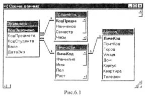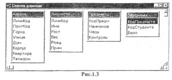 7.2. Просмотреть схему данных, состоящую из 4-х несвязанных таблиц Личности, Адреса, Предметы и Экзамены, которые входят в состав базы данных База]. Установить размеры индивидуальных окон для каждой таблицы и для всей схемы данных так, как показано на рис.1.3.
