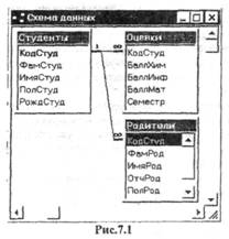 7.1. Активизировать режим Добавление таблицы ( ) и добавить в схему данных вновь созданные таблицы. Схема данных должна выглядеть так, как показано на рис. 1.3.