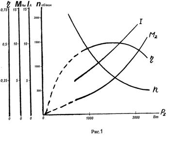 При теоретическом холостом ходе, когда Р2=0, h = 0. При увеличении нагрузки КПД сначала быстро увеличивается до максимального значения, а затем начинает уменьшаться.