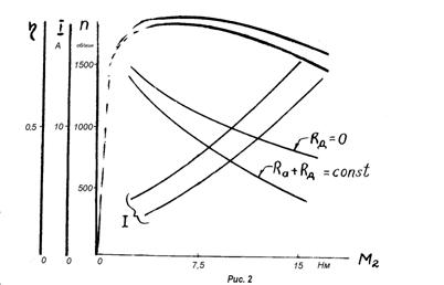 На рис. 2 изображены механические, токовые и характеристики КПД двигателя последовательного возбуждения, снятые при отсутствии(естественная характеристика) и наличии добавочного сопротивления Rд (искусственная характеристика).