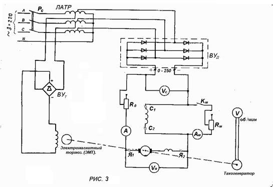 Описание схемы. На рис.3 показана схема, собранная на испытательном стенде. При включении выключателя Рс напряжение попадает на автотрансформатор ЛАТР, который является регулируемым источником питания стенда.