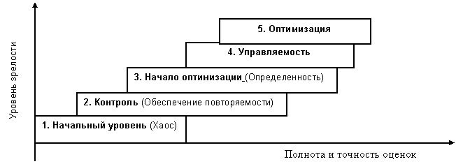 Прагматичные американцы разработали и даже оформили в виде стандарта методику CMM-SW. (Capability Maturity Model for Software – Эволюционная модель развития способности компании разрабатывать и сопровождать ПО) [7]. Согласно этой методике предприятия классифицируются по уровню зрелости их систем управления (рис. 4). Каждому уровню соответствует требуемая и достижимая полнота и точность оценок состояния производства, используемых при принятии управленческих решений. Соответственно, для каждого уровня требуются различные виды программного обеспечения. Предприятие должно дорасти (дозреть) до внедрения эффективных методов управления. Преждевременное внедрение продвинутой программы неэффективно в связи с тем, что предприятие не готово ее использовать. В тоже время, внедрение упрощенной программы на предприятии, достигшем высокого уровня зрелости также неэффективно, т. к. потребность в решаемых этой программой задачах отпала.