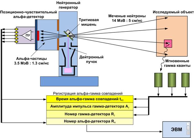 При зондировании объекта исследования нейтронами в результате реакций радиационного захвата или неупругого рассеяния нейтронов возникает гамма-излучение дискретной энергии, которое может быть зарегистрировано одним или несколькими гамма-детекторами. Спектральный состав гамма-излучения дает информацию о наличии в объекте водорода, азота, кислорода и углерода, входящих в состав органических веществ. Одна из основных проблем использования нейтронных методов состоит в высоком уровне фоновой загрузки гамма-детектора при регистрации информационного излучения. За счет пространственной и временной селекции событий можно существенно снизить уровень регистрируемого фонового излучения. Для этого информация о событии обрабатывается и записывается лишь при одновременной регистрации альфа-частицы и гамма-кванта в узком временном окне, соответствующем времени пролета нейтроном исследуемого объекта. Код события содержит данные об интервале времени tαg между срабатыванием альфа - и гамма-детекторов при их совпадениях в заданном окне, координате пиксела альфа-детектора, номере (координате) гамма-детектора и амплитуде импульса с гамма - детектора. Совокупность событий позволяет при использовании соответствующих алгоритмов обработки информации определить объемное распределение химических элементов в объекте исследования.