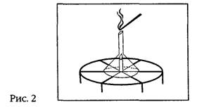 Это задание на логическое мышление. Каждый прибор может быть использован, и задача учащихся выделить общее существенное свойство этих разных по форме и размерам предметов. Обсудив предложения, учитель проводит экспериментальное определение продуктов горения свечи (рис.2). На железную решетку с ножками устанавливает зажженную свечу и накрывает ее воронкой. Через некоторое время воронка запотевает в результате образования воды (прибор должен быть освещен так, чтобы это было хорошо видно). Горящая лучина, поднесенная к верхнему отверстию воронки, гаснет, так как через него выходит другой продукт реакции — углекислый газ.