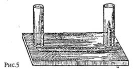 Учитель демонстрирует условия горения с помощью прибора Фарадея (рис.5). Две широкие стеклянные трубки соединены вырезанным в доске желобом, скрытым от глаз учащихся. В одну из вертикальных трубок учитель ставит зажженную свечу — она продолжает гореть, так как в результате конвекции продукты горения уносятся вверх по трубке, а свежие порции воздуха поступают через соседнюю трубку. Что будет со свечой, если закрыть рукой отверстие соседней трубки, через которую поступает кислород? Учитель делает это, в результате свеча гаснет.