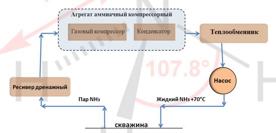 Газообразный аммиак сжимается в газовом компрессоре агрегата аммиачного компрессорного выше давления насыщения (при +200С, 0,85 МПа, при +700С, 2,2 МПа) с одновременным повышением температуры. Далее горячий с высоким давлением газожидкостная смесь поступает в конденсатор, где оставшийся газ переводится в жидкое состояние. Далее уже жидкий аммиак проходит через теплообменник, нагревается до нужной температуры. И насосом закачивается в скважину. Весь процесс, проходящий в скважине, изложен выше. Пары аммиака отбираются компрессором, который установлен в агрегате аммиачном компрессорном, проходя через ресивер дренажный, где часть жидкого аммиака осаждается. Далее весь процесс повторяется.