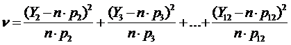 Эта статистика называется статистикой «хи - квадрат» наблюдаемых значений Y2 … Y12 при бросании игральных костей. Используя табл. 4.1, получим :