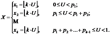 В общем случае можно получить, если необходимо, различные веса для целых чисел. Рассмотрим такую процедуру. Предположим, что значение X = x1 должно быть получено с вероятностью p1, X = x2 — с вероятностью p2, … и X = xk — с вероятностью pk.