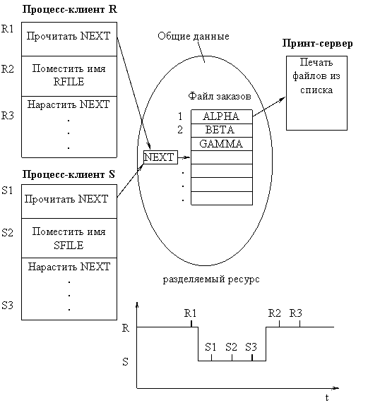 Пренебрежение вопросами синхронизации процессов, выполняющихся в режиме мультипрограммирования, может привести к их неправильной работе или даже к краху системы. Рассмотрим, например (рис. 10), программу печати файлов (принт-сервер). Эта программа печатает по очереди все файлы, имена которых последовательно в порядке поступления записывают в специальный общедоступный файл "заказов" другие программы. Особая переменная NEXT, также доступная всем процессам-клиентам, содержит номер первой свободной для записи имени файла позиции файла "заказов". Процессы-клиенты читают эту переменную, записывают в соответствующую позицию файла "заказов" имя своего файла и наращивают значение NEXT на единицу. Предположим, что в некоторый момент процесс R решил распечатать свой файл, для этого он прочитал значение переменной NEXT, значение которой для определенности предположим равным 4.