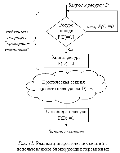 Другим способом является использование блокирующих переменных. С каждым разделяемым ресурсом связывается двоичная переменная, которая принимает значение 1, если ресурс свободен (то есть ни один процесс не находится в данный момент в критической секции, связанной с данным процессом), и значение 0, если ресурс занят. На рис. 11 показан фрагмент алгоритма процесса, использующего для реализации взаимного исключения доступа к разделяемому ресурсу D блокирующую переменную F(D). Перед входом в критическую секцию процесс проверяет, свободен ли ресурс D. Если он занят, то проверка циклически повторяется, если свободен, то значение переменной F(D) устанавливается в 0, и процесс входит в критическую секцию. После того, как процесс выполнит все действия с разделяемым ресурсом D, значение переменной F(D) снова устанавливается равным 1.