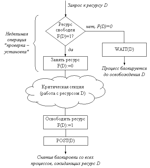 Если ресурс занят, то процесс не выполняет циклический опрос, а вызывает системную функцию WAIT(D), здесь D обозначает событие, заключающееся в освобождении ресурса D. Функция WAIT(D) переводит активный процесс в состояние ОЖИДАНИЕ и делает отметку в его дескрипторе о том, что процесс ожидает события D. Процесс, который в это время использует ресурс D, после выхода из критической секции выполняет системную функцию POST(D), в результате чего операционная система просматривает очередь ожидающих процессов и переводит процесс, ожидающий события D, в состояние ГОТОВНОСТЬ.