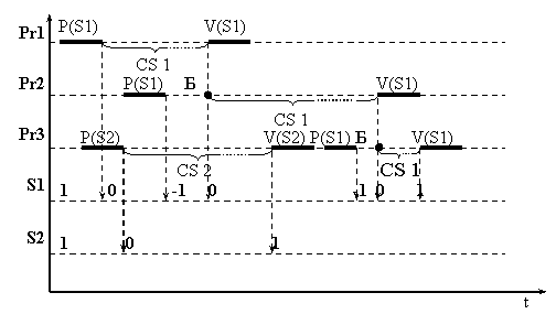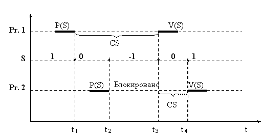 До момента t 1 ресурс был не занят. В момент t 1 процесс Pr1, выполняет операцию P(S) и входит в критический участок (CS). В момент t2 процесс Pr2 выполняет операцию P(S) – занять ресурс, это приводит к изменению: S = –1 – означает, что Pr2 в состоянии блокирования.