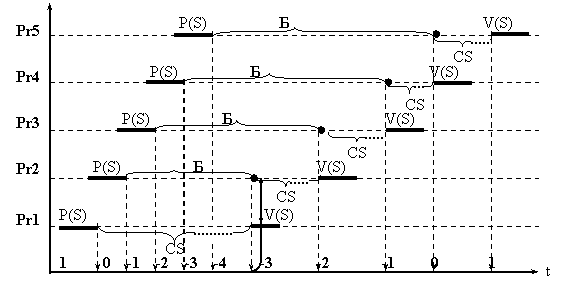 В момент t 4 процесс Pr2 освобождает ресурс, выполняется операция V(S), которая изменяет значение S на 1 (т. е. S=1).