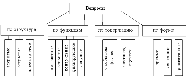 По содержанию выделяют вопросы о фактах, событиях, знаниях и вопросы о мотивах, оценках, установках, мнениях.