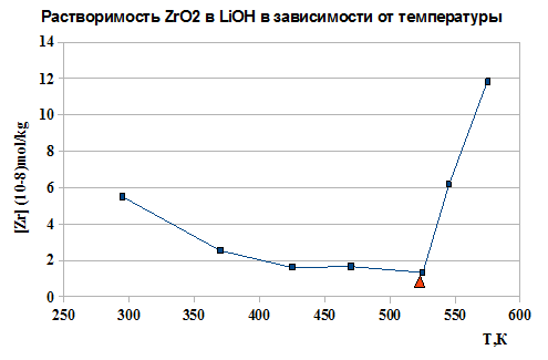 Данная кривая дает информацию, что растворимость диоксида циркония показывает очень слабую зависимость от температуры между 373 и 523 К. Выше же 523 К растворимость растет с увеличением температуры. На данном графике также нанесена точка (▲) показывающая растворимость ZrO2 в воде, определенная в настоящем эксперименте. Эта точка имеет незначительное отклонение от кривой, поэтому значение растворимости циркония в ней можно считать достоверным.