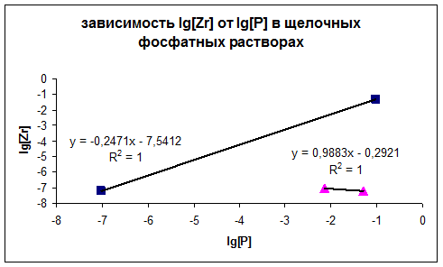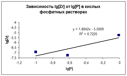 Рис. 5.5. Зависимость lg[Zr] от lg[P] в кислых фосфатных растворах