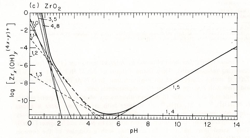 Приложение 1. Диаграмма продуктов гидролиза при I=1 и 25 С растворов, содержащих ZrO2 [86CHA/BAE]
