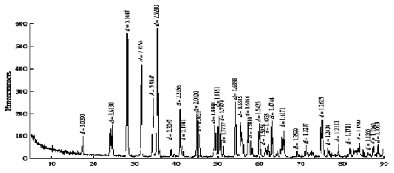 Дифрактограмма исходного бадделеита представлена на рис. 5.2. Помимо циркония в бадделеите имеются примеси Hf-0,7 вес. %, Nb - 0,3 вес. %, Y<0,3 вес. %, Fe< 0,02 вес. % (рентгено - флюорисцентный анализ ) и меньше 0,01-0,05 % к