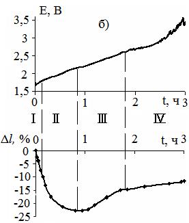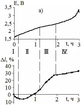 с образованием бисульфата графита (БГ) различных ступеней (n = 1;2;3…). Для крупной фракции графита эти области характеризуются динамичным подъемом кривой Δl-τ, что обусловлено раздвижкой углеродных слоев в графите при внедрении интеркалата (HSO4-, H2SO4)(рис. 1а).