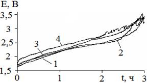 Сравнение Е-τ-кривых для различных фракций графита при гальваностатическом синтезе ТРСГ приведены на рис. 2. Уменьшение размеров частиц графита приводит к увеличению поляризации анода, что обусловлено повышением омического сопротивления насыпного электрода из-за увеличения числа контактных переходов между зернами графита.