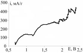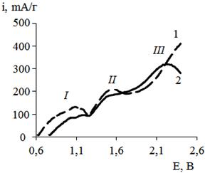 На дисперсном графите, как и ранее на образцах пиролитического графита, удалось выявить области потенциалов, характерных для процессов интеркалирования (I), переокисления (II) и выделения О2 (III). Предположения о влиянии размера частиц исходного графита на кинетику внедрения подтверждаются разностью значений токов в областях I и II (рис. 3). Токи, характеризующие преимущественно объемные процессы внедрения и переокисления, для крупнодисперсного графита выше на 10-30 мА/г. Пороговый потенциал интеркалирования для мелкодисперсной фракции смещен в положительную сторону из-за большей поляризуемости. Выделение О2 для фракции <40 мкм регистрируется при меньших потенциалах и протекает интенсивнее, снижение токов при достижении 2,2 В обусловлено постепенным выключением части насыпного электрода из реакции из-за его газонаполнения.