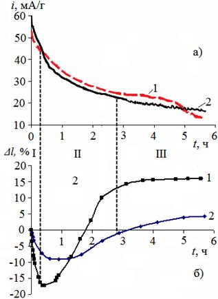 Для предотвращения интенсивного выделения кислорода на электродах с учетом результатов гальваностатического синтеза был проведен потенциостатический синтез образцов ТРСГ при потенциале 2,4 В (рис. 4). Индукционный период (I) для мелкодисперсного графита характеризуется более высокими токами и длительным минимумом по толщине графитового слоя. В области II, характеризующей преимущественно объемные реакции интеркалирования, для крупной фракции отмечаются более высокие скорости и значительное увеличение толщины графитового слоя (рис.4). Выявленные закономерности хорошо согласуются с приведенными ранее результатами. Повышенная поверхность фракции графита < 40 мкм стимулирует поверхностные реакции, а меньшая насыпная плотность исходного графита (233 г/дм3) по сравнению с крупнодисперсным (444 г/дм3) приводит к незначительному увеличению толщины графитового анода. В области III на кривой 2 (рис. 4) отмечается появление осцилляций, характерных для выделения О2, для более крупной фракции – снижение тока. Все это согласуется с результатами гальваностатического синтеза и хроновольтамперометрическими измерениями, где отмечалось выделение О2 при меньших потенциалах.