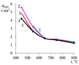 Размер частиц, мкм | dТРСГ, г/дм3 | Δm, % | -Δm, % | dТРГ при 900ºС, г/дм3 | Степень VТРГ/VОГ | |